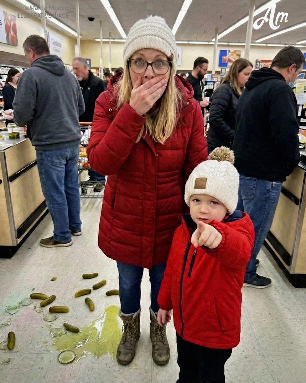 Her grip loosened, and the glass jar of pickles slipped from her hands and shattered on the floor between us. Bits of green, brine, and broken glass splashed everywhere, but she didn’t even flinch or blink!