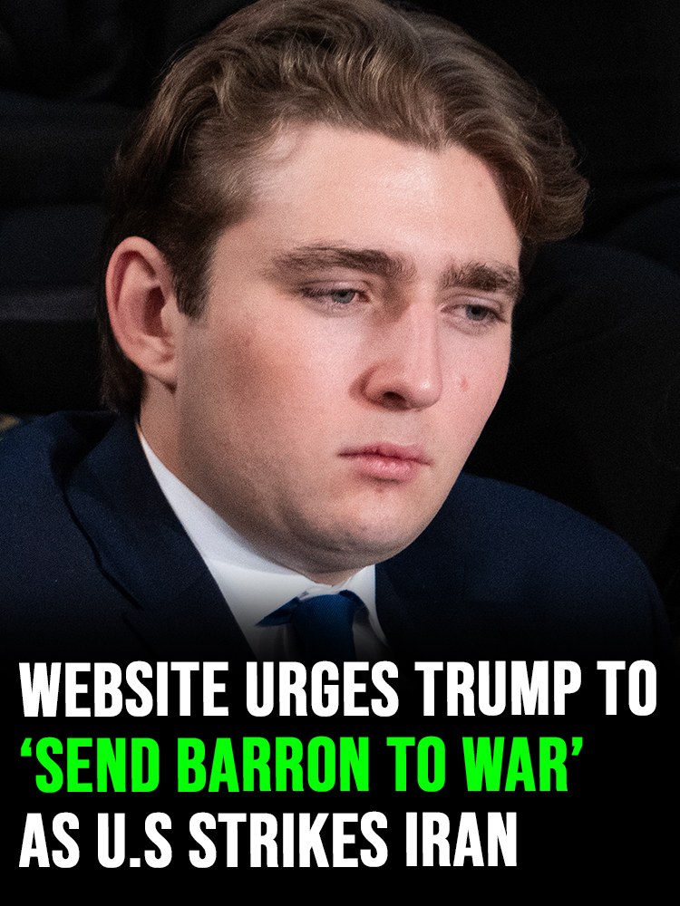 The site humorously suggests that President Donald Trump should “draft” his youngest son, Barron Trump, to serve in the conflict — a parody that mimics patriotic language but is clearly exaggerated.