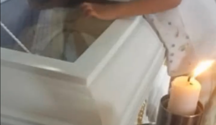 According to reports, the photograph was shared by a relative who witnessed the moment at the graveside, saying the child brought a small chair to help himself reach his mother’s casket more easily.