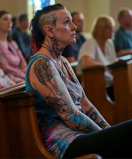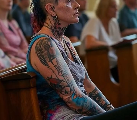 A woman, appearing to be in her forties, entered the church with her arms, neck, and visible parts of her body adorned with intricate tattoos, accompanied by multiple piercings on her ears, nose, and eyebrows.