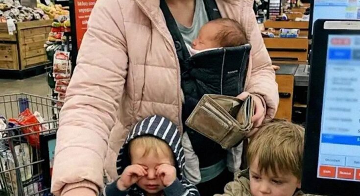 A toddler sat in the cart crying. A preschooler clung to her leg. A baby squirmed in a carrier strapped to her chest.