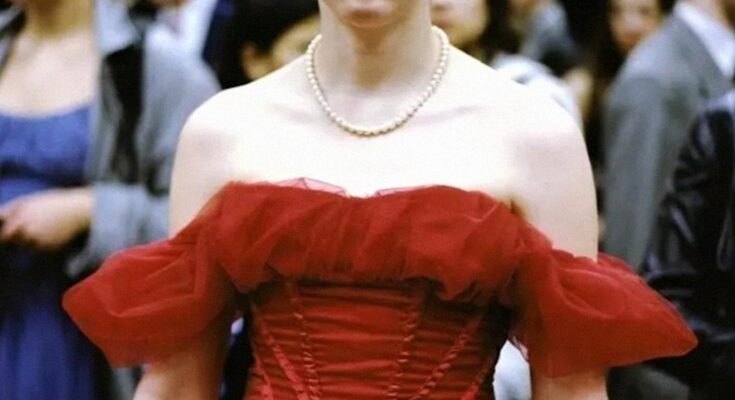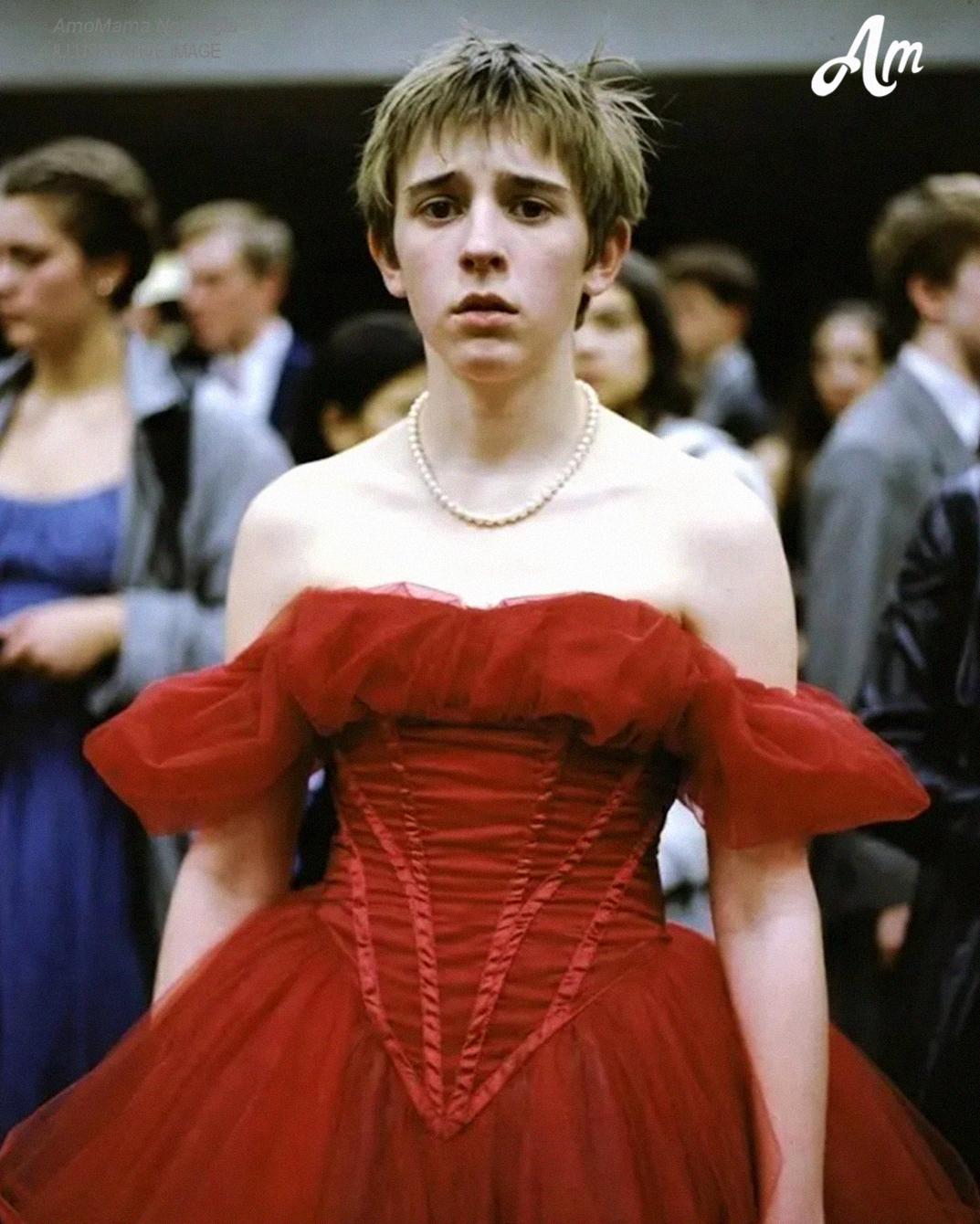 Liam walked through the double doors in a red, flowing dress that shimmered under the auditorium lights.