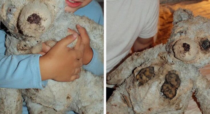 When my son found a filthy, one-eyed teddy bear half-buried in the grass, I didn’t want to take it home, but my son wouldn’t let go. That night, when I brushed its belly as he slept, something inside clicked, and a trembling voice whispered his name, begging for help.